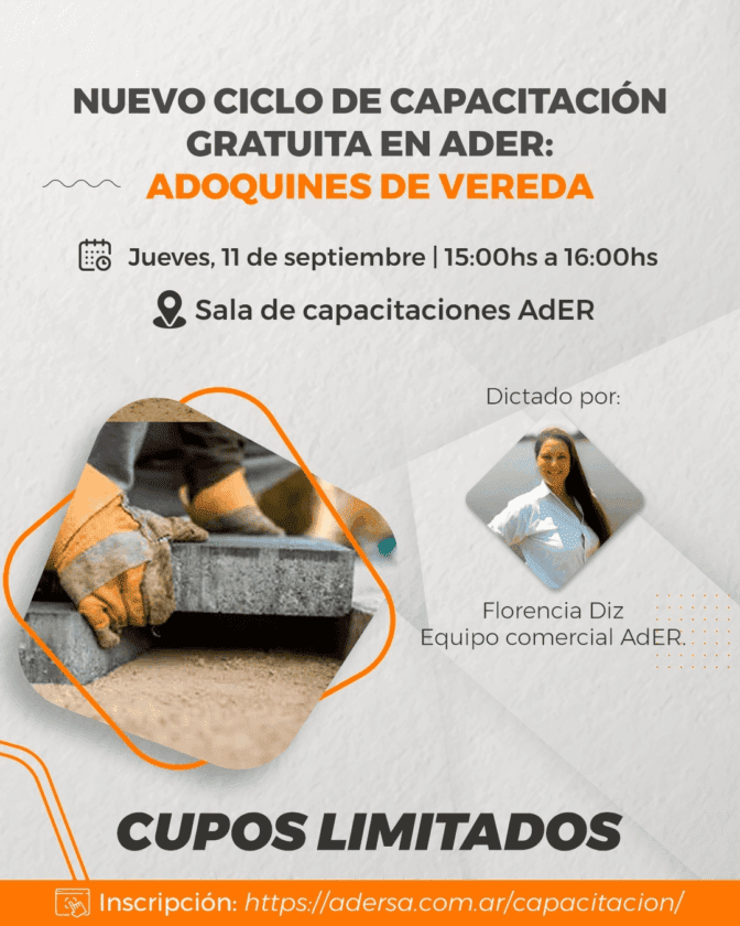 La empresa AdER S.A. ha inaugurado un nuevo ciclo de capacitación teórico-práctica dirigida específicamente a trabajadores del sector de la construcción, focalizado en la correcta colocación de adoquines de hormigón para veredas. La actividad se desarrolla en la sala de capacitaciones de la empresa, ubicada en el Kilómetro 134 de la Autovía 14, en Concepción del Uruguay, Entre Ríos .