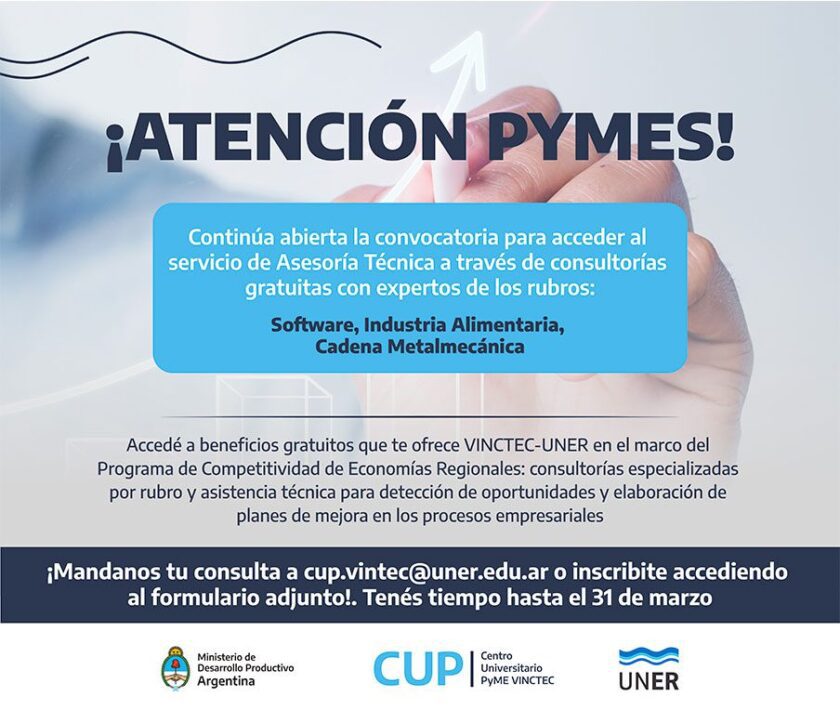 La convocatoria se realiza en el marco del programa de Coordinación Universidad Pyme (CUP), una iniciativa del Ministerio de Desarrollo Productivo de la Nación al que adhirió la VINCTEC-UNER con el objetivo de brindar instancias de consultoría gratuita para pymes entrerrianas. En ese marco, se ofrecen consultorías especializadas por rubro y asistencia técnica para detección de oportunidades y elaboración de planes de mejora en los procesos empresariales.