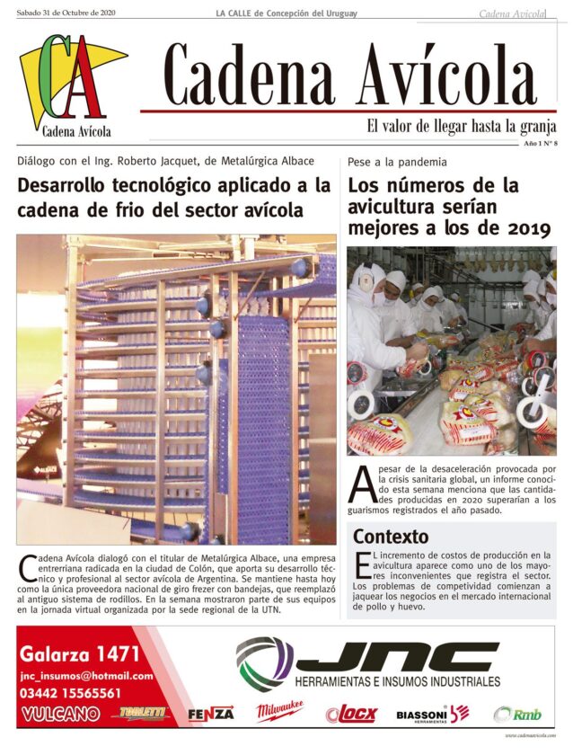 En esta edición: Cadena Avícola dialogó con el titular de Metalúrgica Albace, una empresa entrerriana radicada en la ciudad de Colón, que aporta su desarrollo técnico y profesional al sector avícola de Argentina. Se mantiene hasta hoy como la única proveedora nacional de giro frezer con bandejas, que reemplazó al antiguo sistema de rodillos. En la semana mostraron parte de sus equipos en la jornada virtual organizada por la sede regional de la UTN.