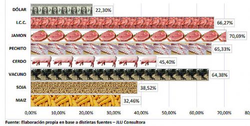 Como ya comentamos, el precio del vacuno se desboco después de las elecciones y marcó una diferencia muy grande para un mes. El maíz que había retrocedido el mes anterior, volvió a tener una suba considerable, que compensó la no suba de la soja. Los cortes de cerdo tuvieron una fuerte alza, pero inferior a los cortes vacunos.