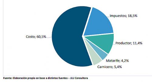 Quisimos hacer la distribución del dinero en los distintos eslabones que lo componen, teniendo en cuenta los costos totales, resultado de la suma de los costos de cada uno de los eslabones y de forma similar a los impuestos. Por cada peso ($) que coloca el consumidor, podemos ver en el Gráfico la distribución en porcentaje (datos del 24/11/2021)