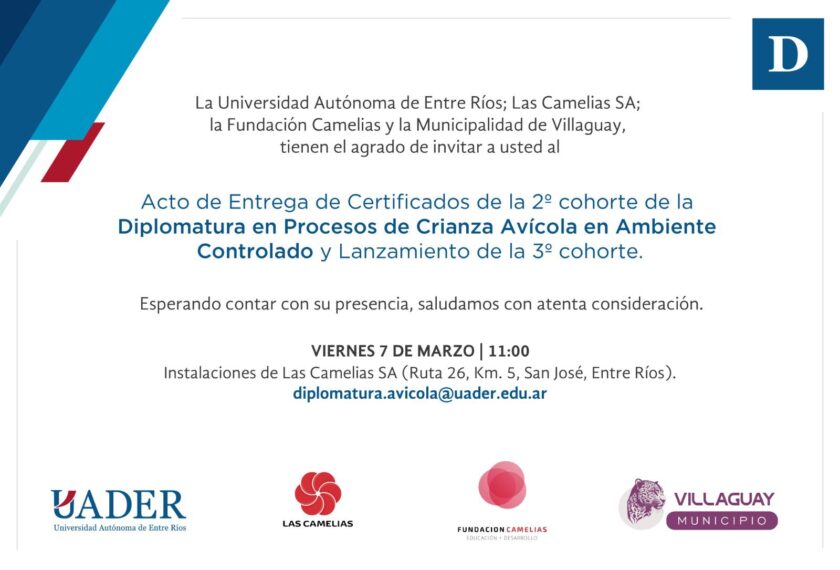 Villaguay, Entre Ríos – La Universidad Autónoma de Entre Ríos (UADER), en conjunto con Las Camelias SA, la Fundación Camelias y la Municipalidad de Villaguay, extienden una cordial invitación a la comunidad al acto de entrega de certificados de la 2º cohorte de la Diplomatura en Procesos de Crianza Avícola en Ambiente Controlado. Además, se llevará a cabo el lanzamiento oficial de la 3º cohorte de este programa formativo.