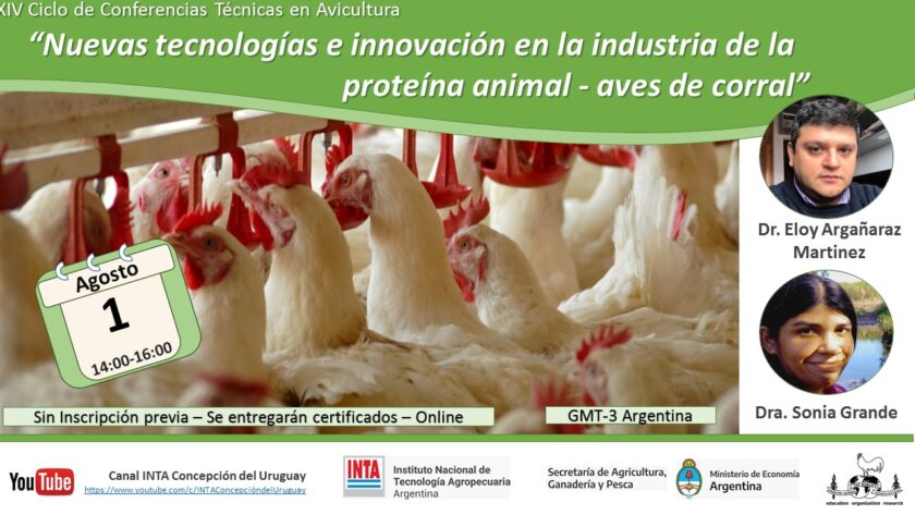 El Ciclo de Conferencias Técnicas en Avicultura se llevará a cabo el día 1 de agosto a las 14:00 horas (GMT-3 Argentina), y será transmitido en vivo a través del canal de YouTube de la Estación Experimental Agropecuaria (EEA) del INTA Concepción del Uruguay.
