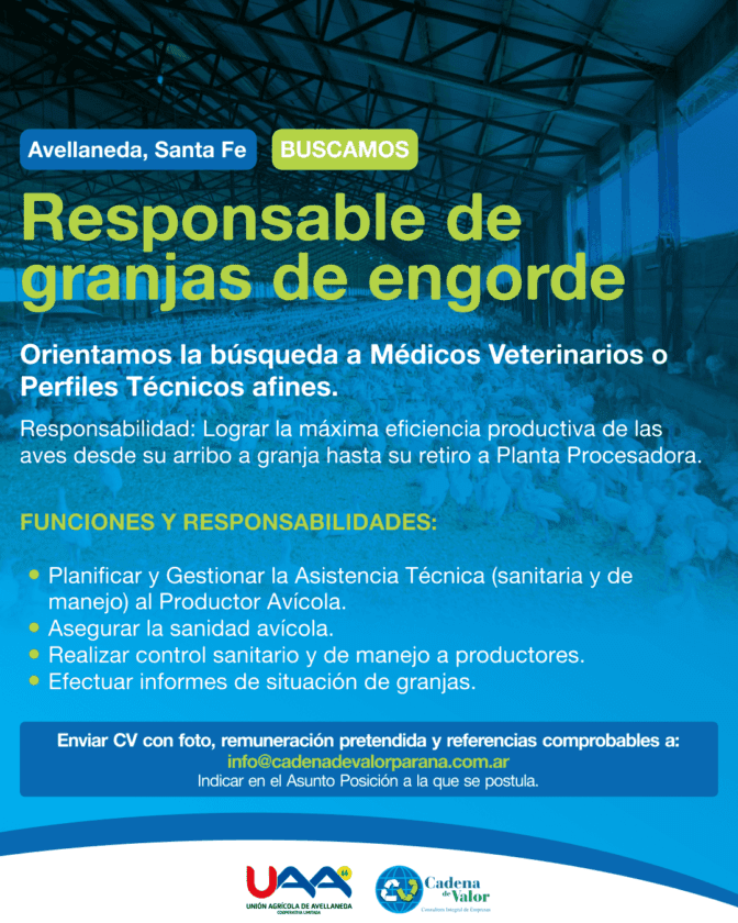 La Consultora Cadena de Valor Paraná informa de una oportunidad laboral en la que pueden desempeñarse profesionales Veterinarios o Técnicos Avícolas.